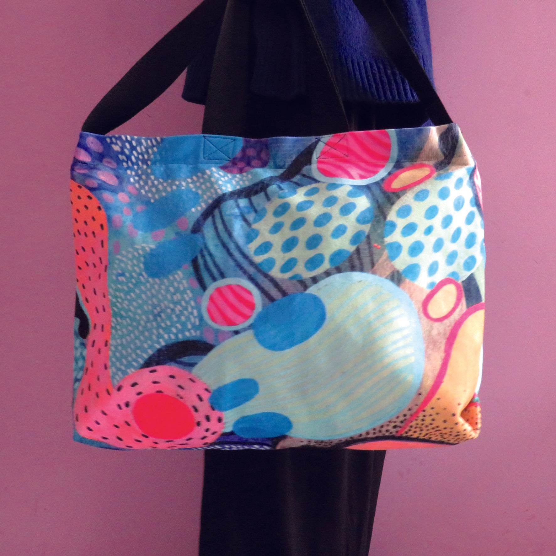 Tote bag in velluto, 55cm x 40cm circa, zip nella parte superiore e fodera interna. Tracolla, 80 cm circa, e manici in cotone