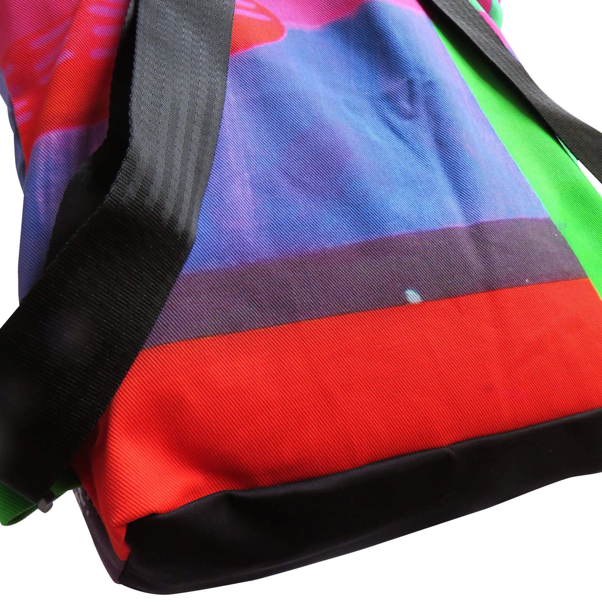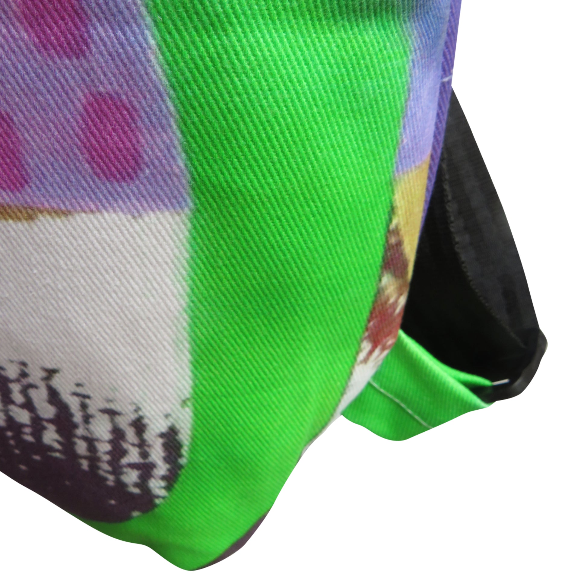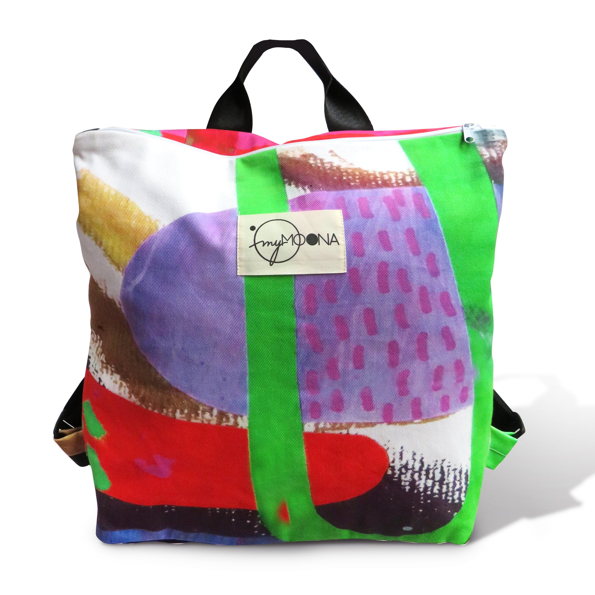 Zaino in cotone 380 gr, bretelle regolabili, chiusura superiore con cerniera, fodera interna, 45cm x 45cm circa.