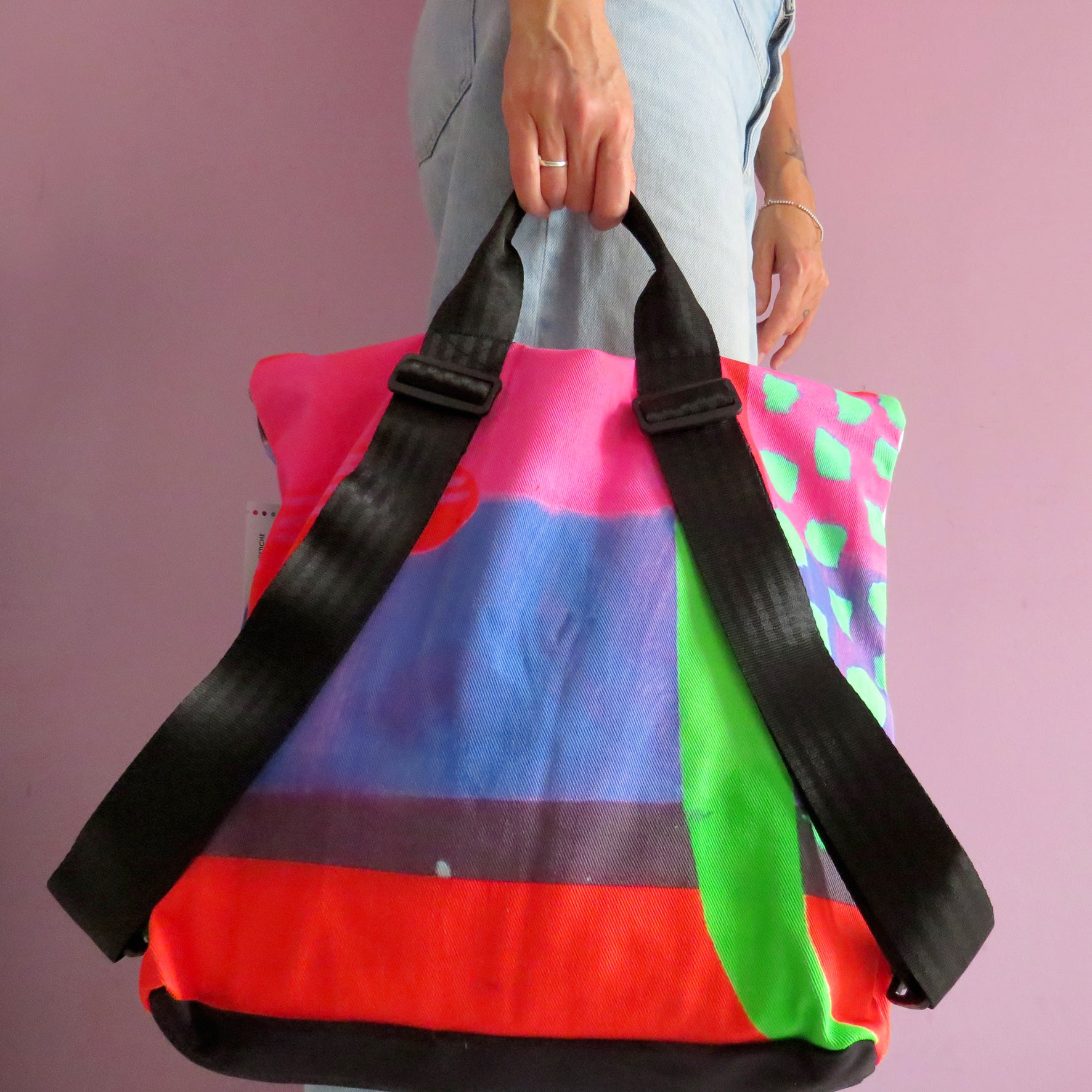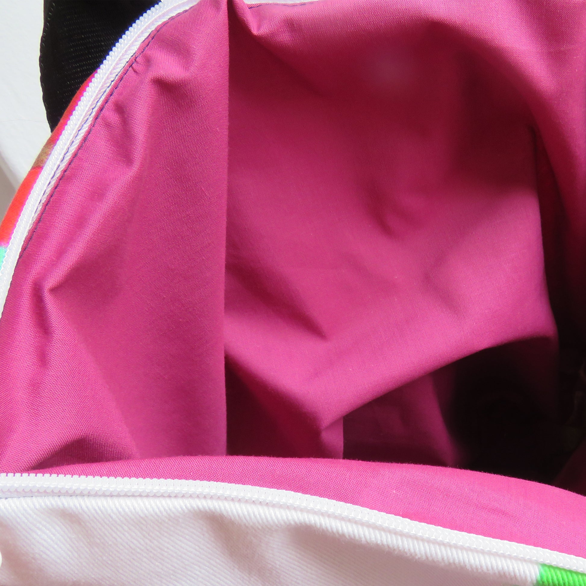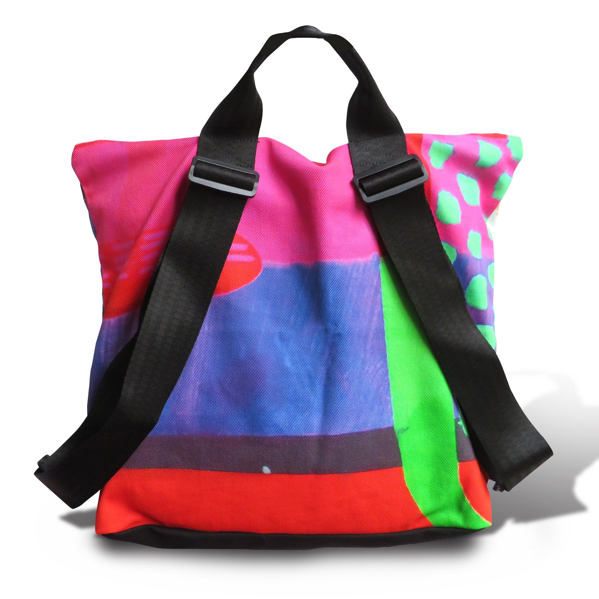 Zaino in cotone 380 gr, bretelle regolabili, chiusura superiore con cerniera, fodera interna, 45cm x 45cm circa.
