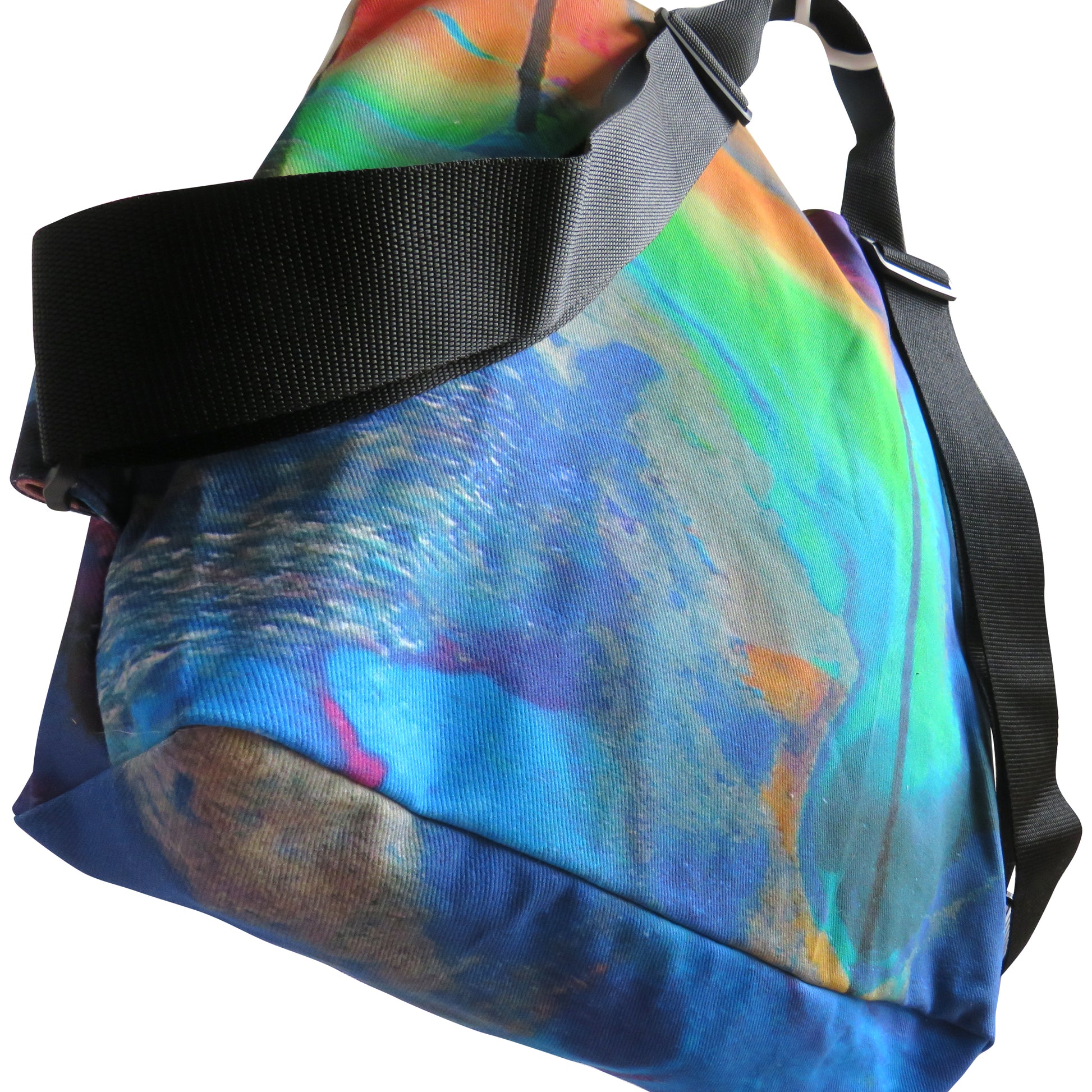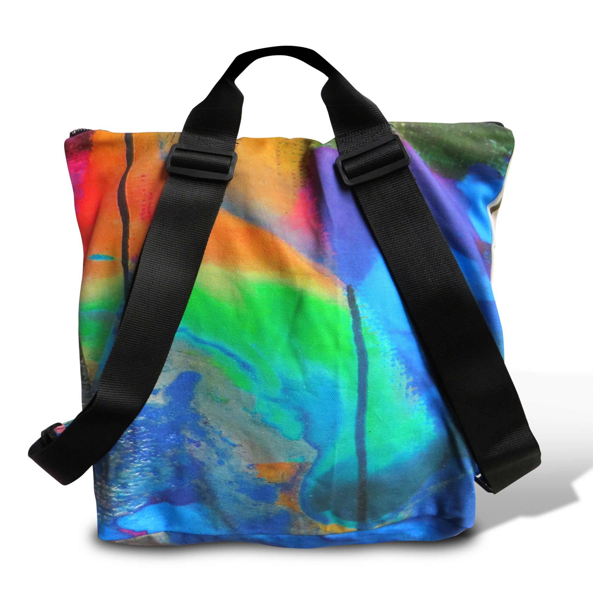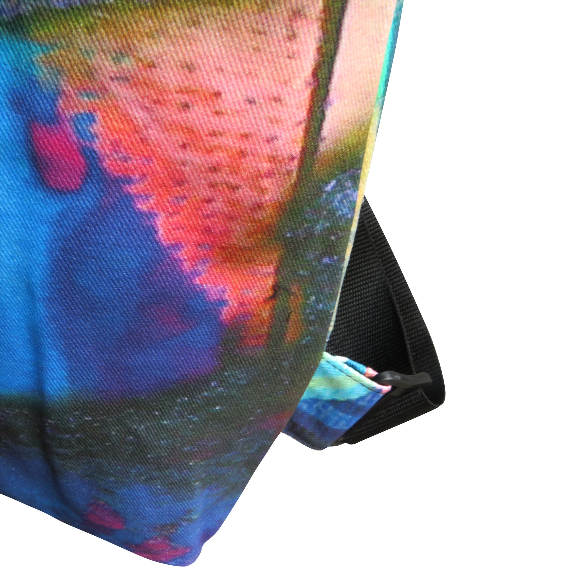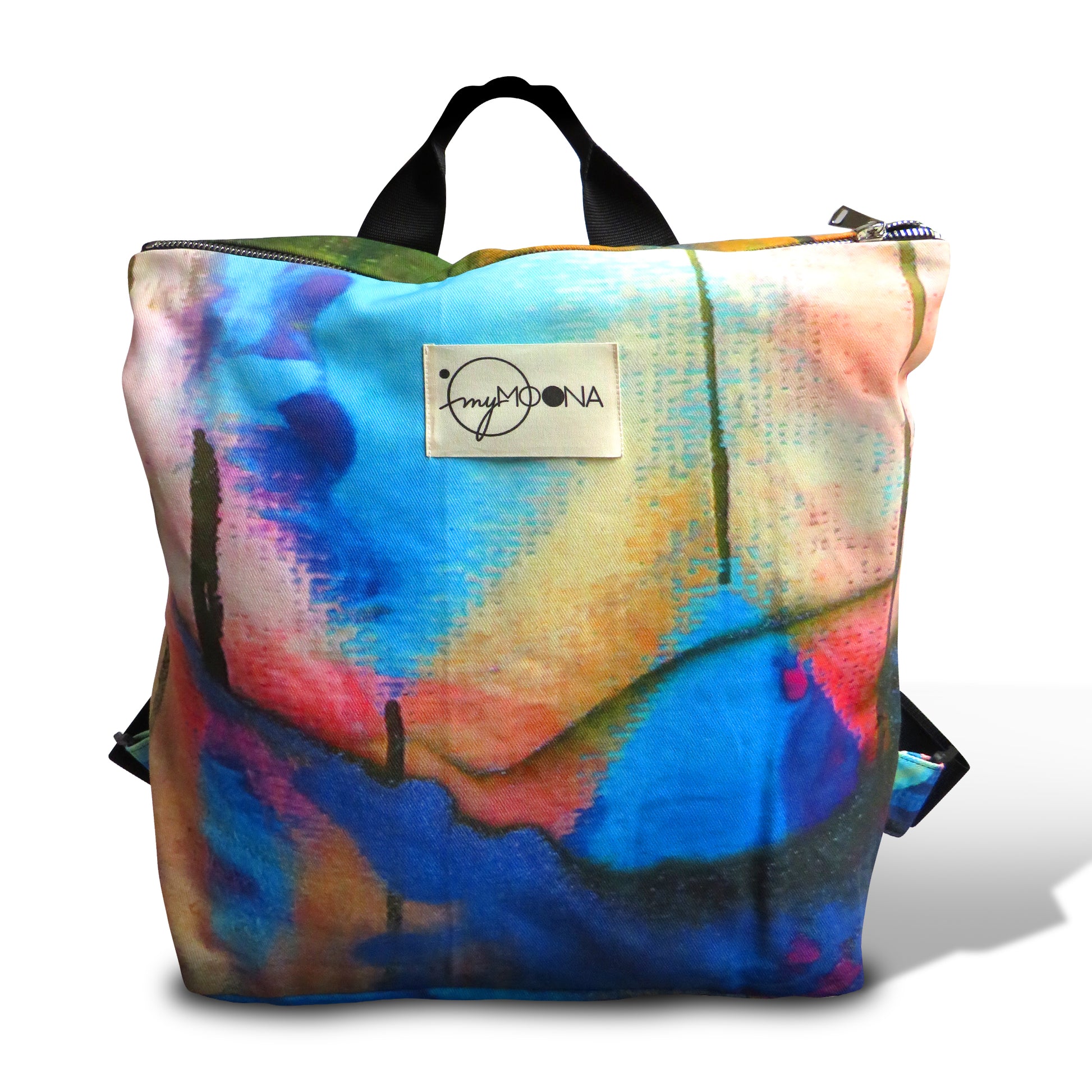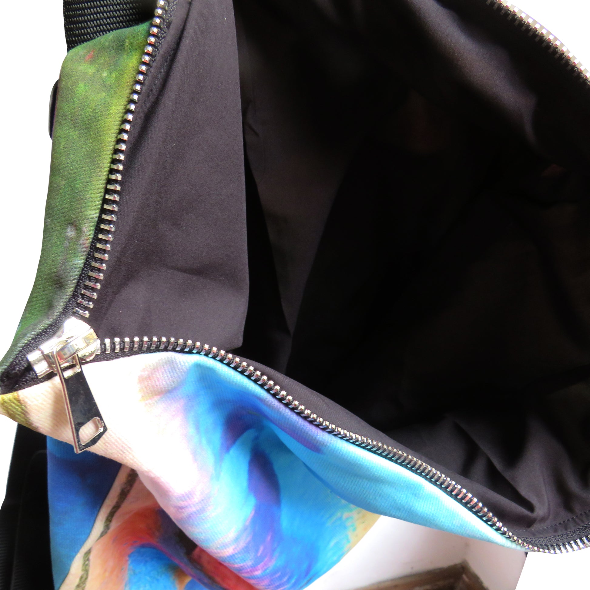 Zaino in cotone 380 gr, bretelle regolabili, chiusura superiore con cerniera, fodera interna, 45cm x 45cm circa.