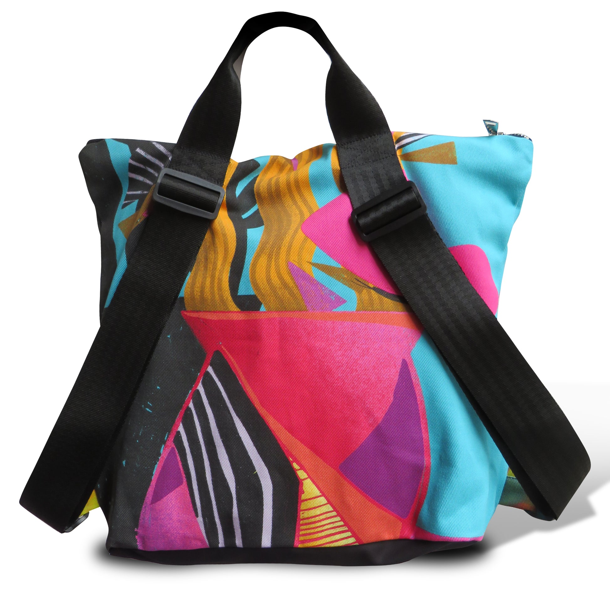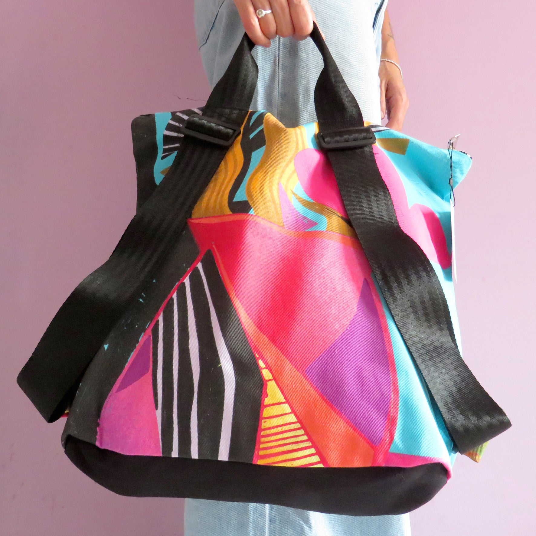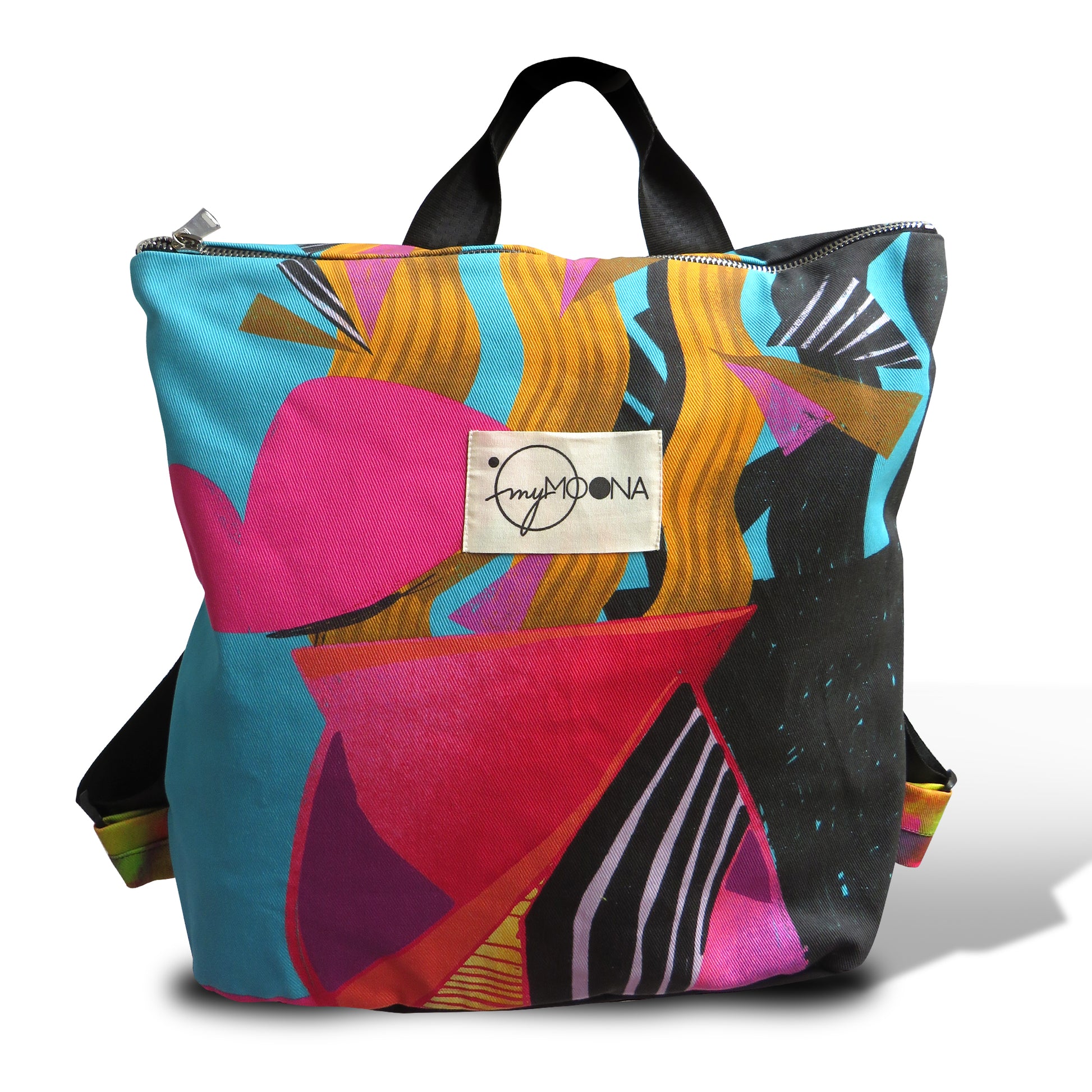 Zaino in cotone 380 gr, bretelle regolabili, chiusura superiore con cerniera, fodera interna, 45cm x 45cm circa.