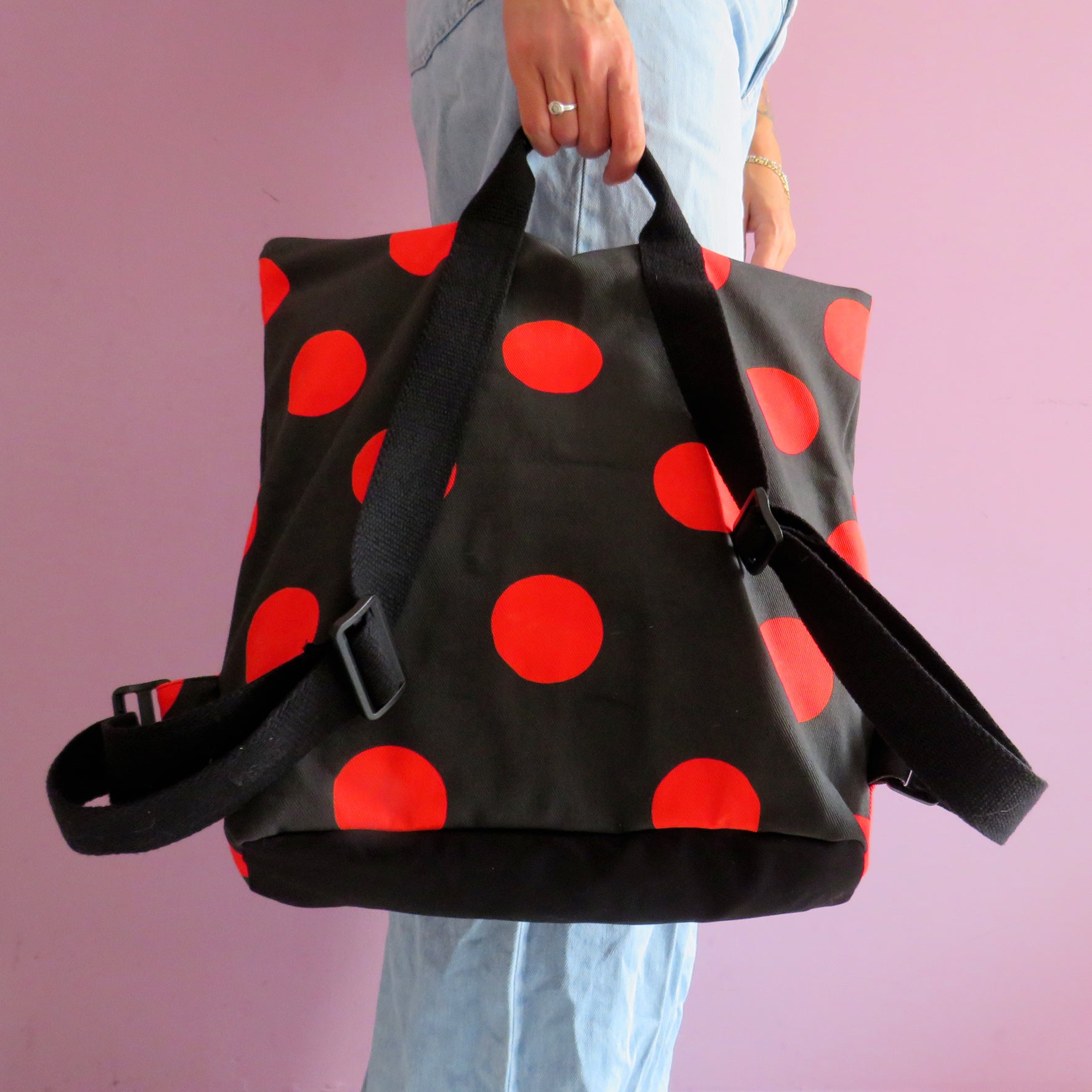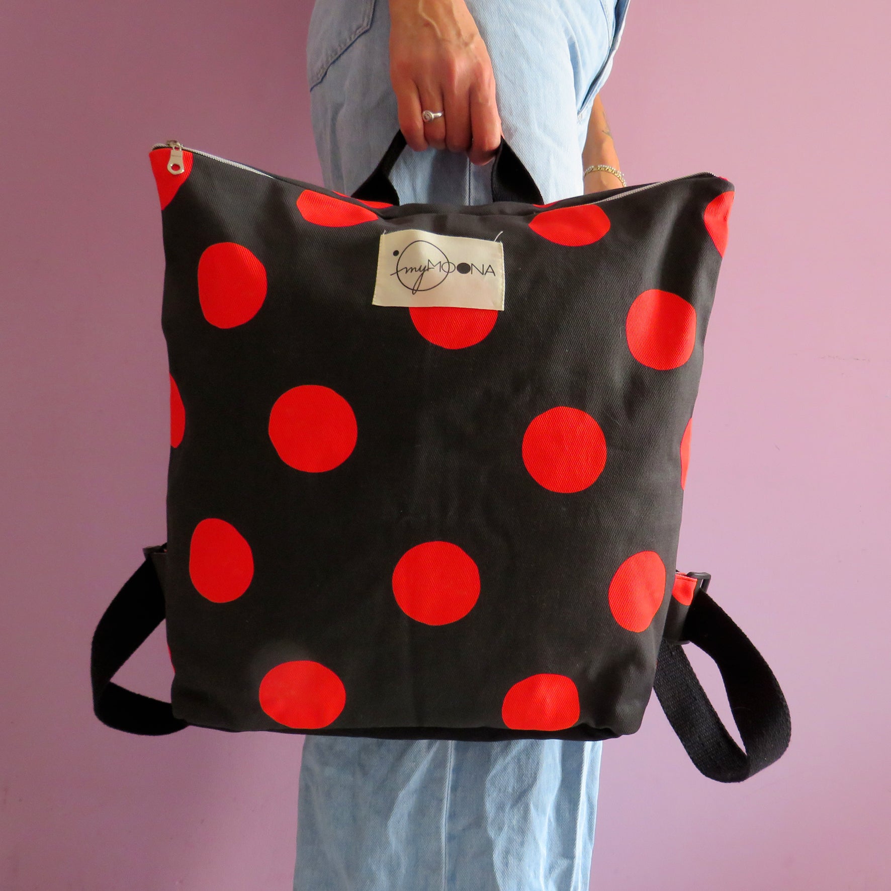 Zaino in cotone 380 gr, bretelle regolabili, chiusura superiore con cerniera, fodera interna, 45cm x 45cm circa.