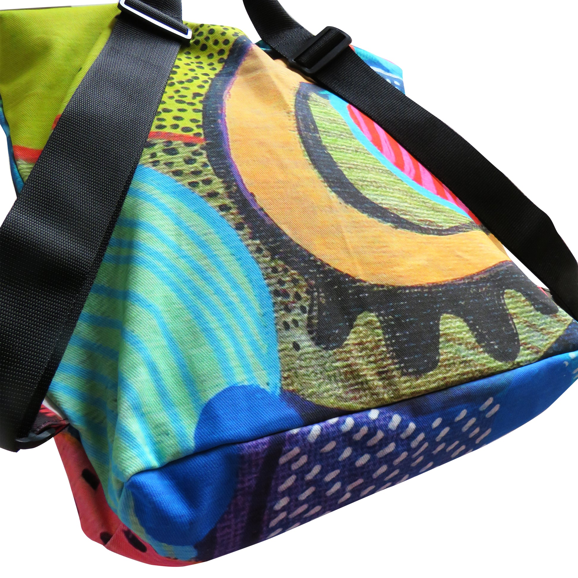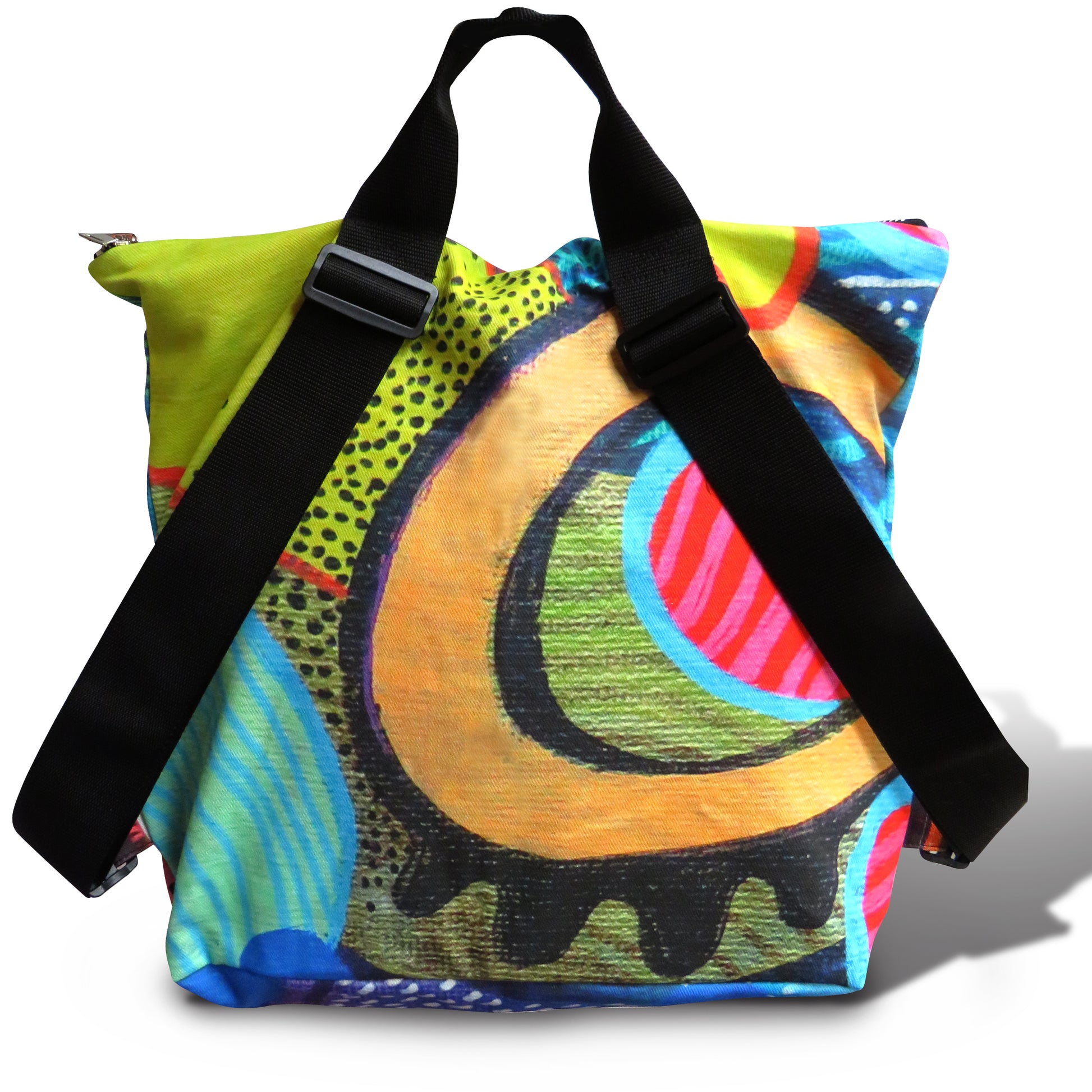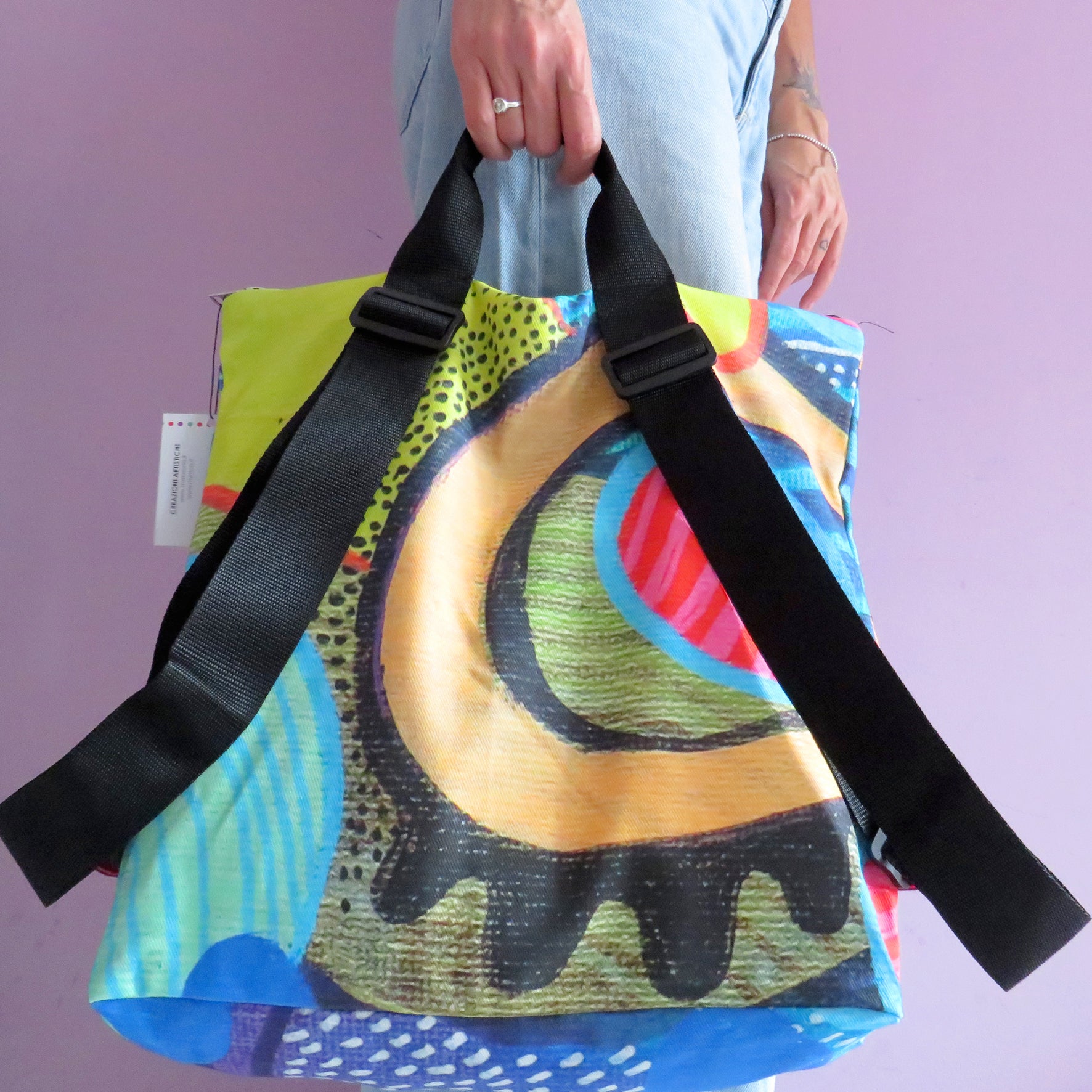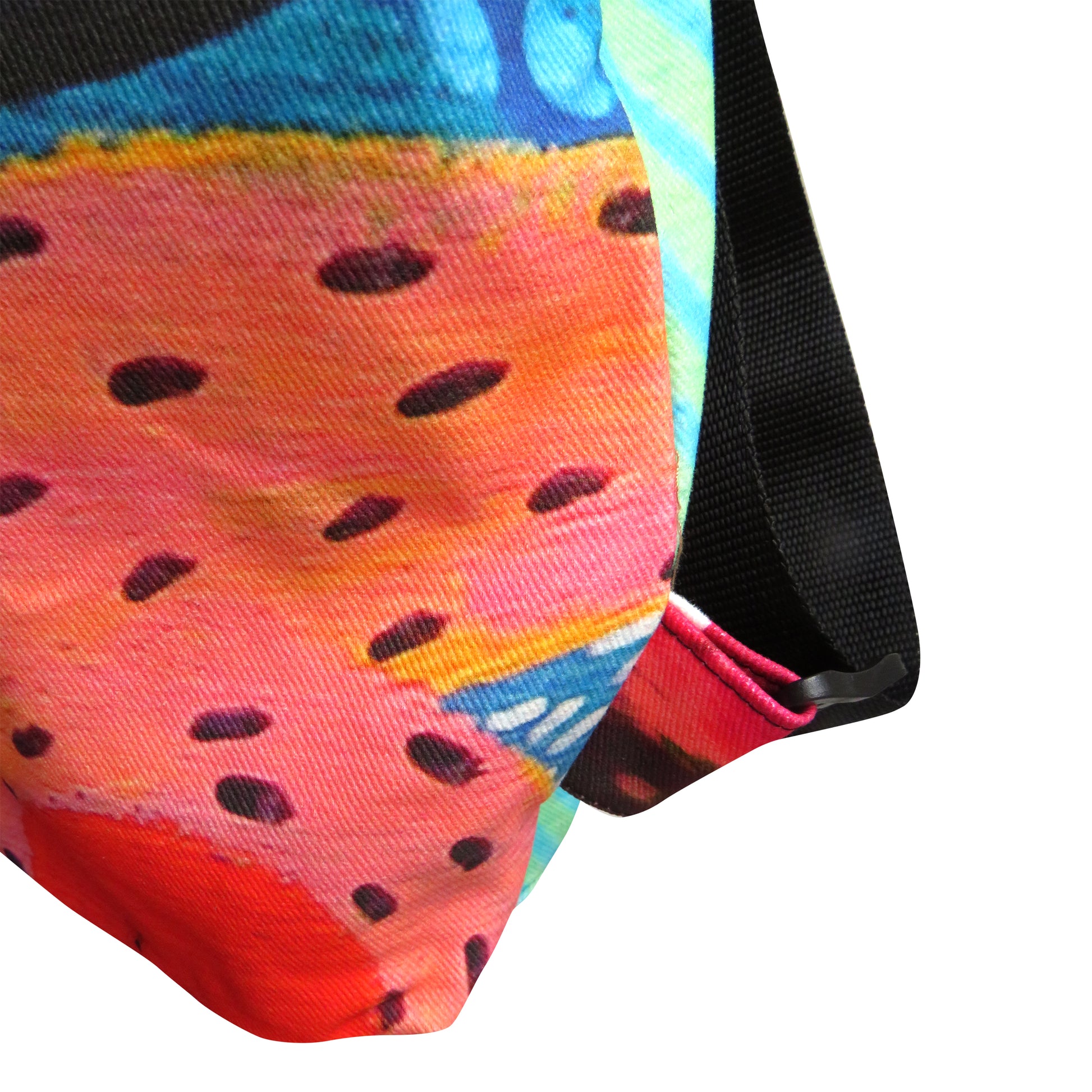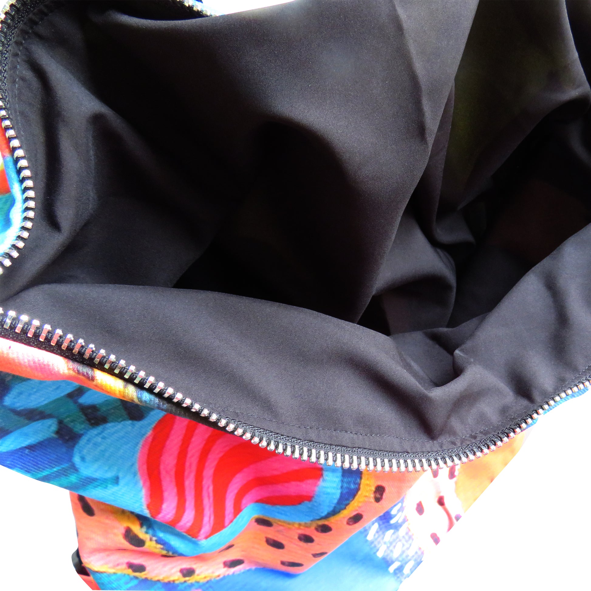 Zaino in cotone 380 gr, bretelle regolabili, chiusura superiore con cerniera, fodera interna, 45cm x 45cm circa.