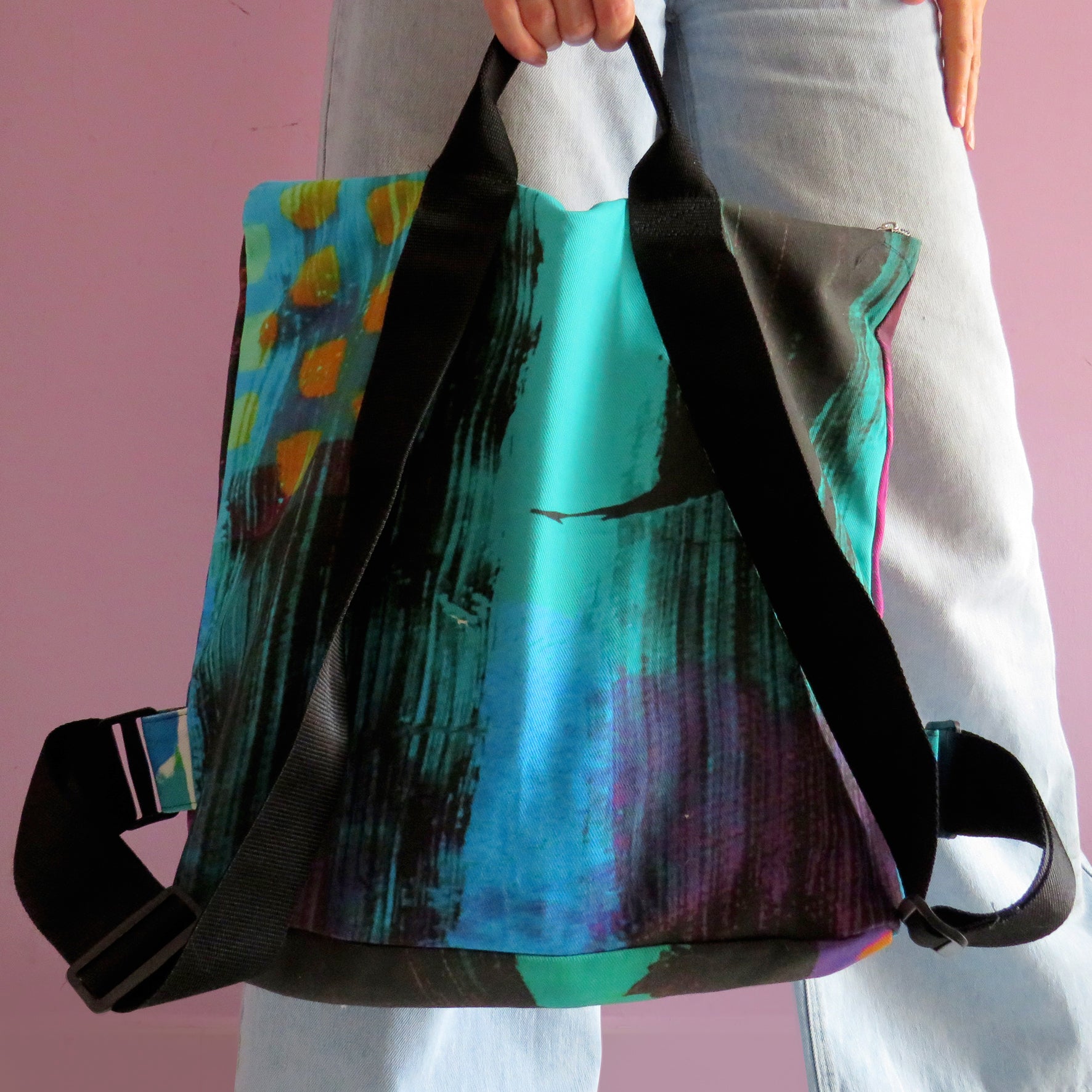 Zaino in cotone 380 gr, bretelle regolabili, chiusura superiore con cerniera, fodera interna, 45cm x 45cm circa.