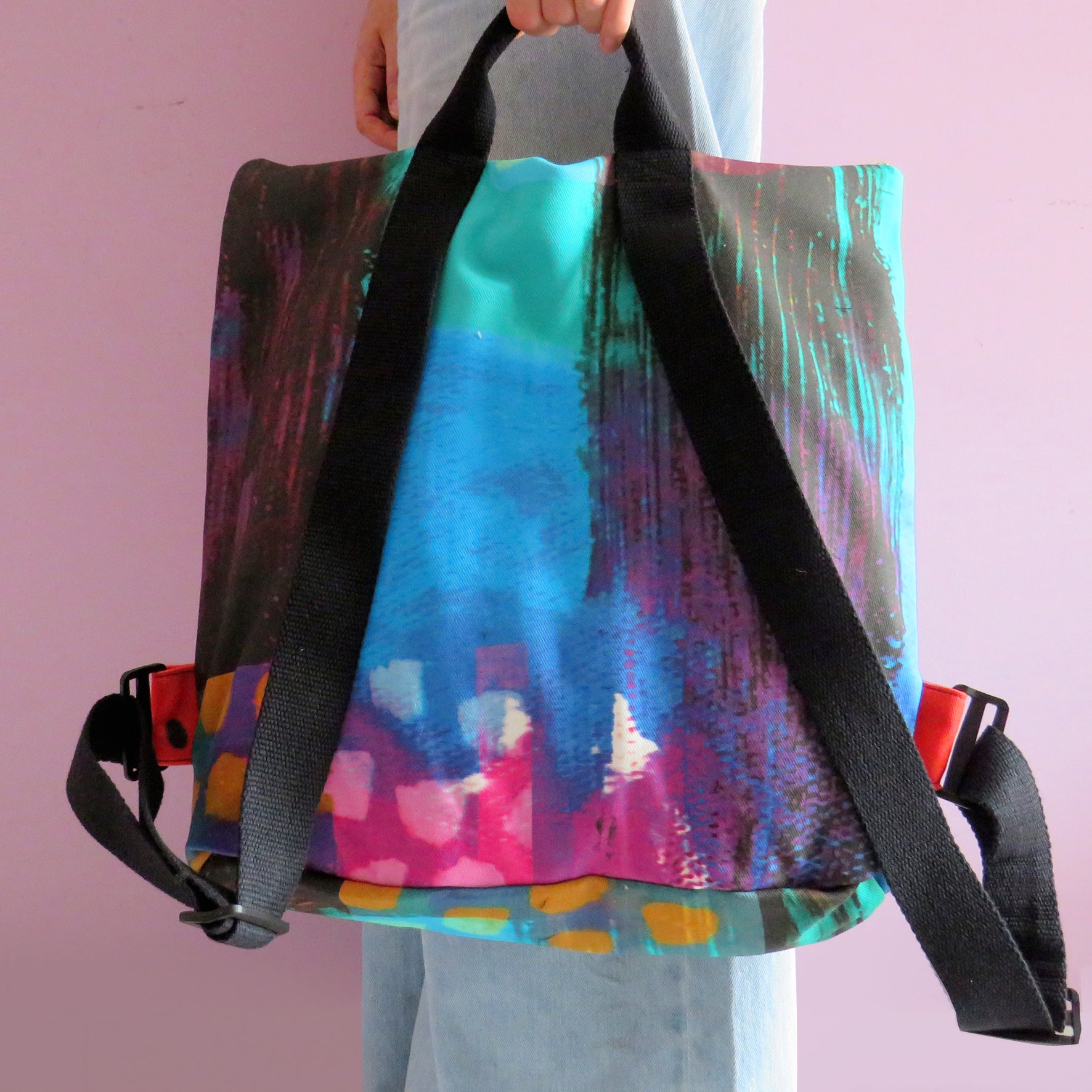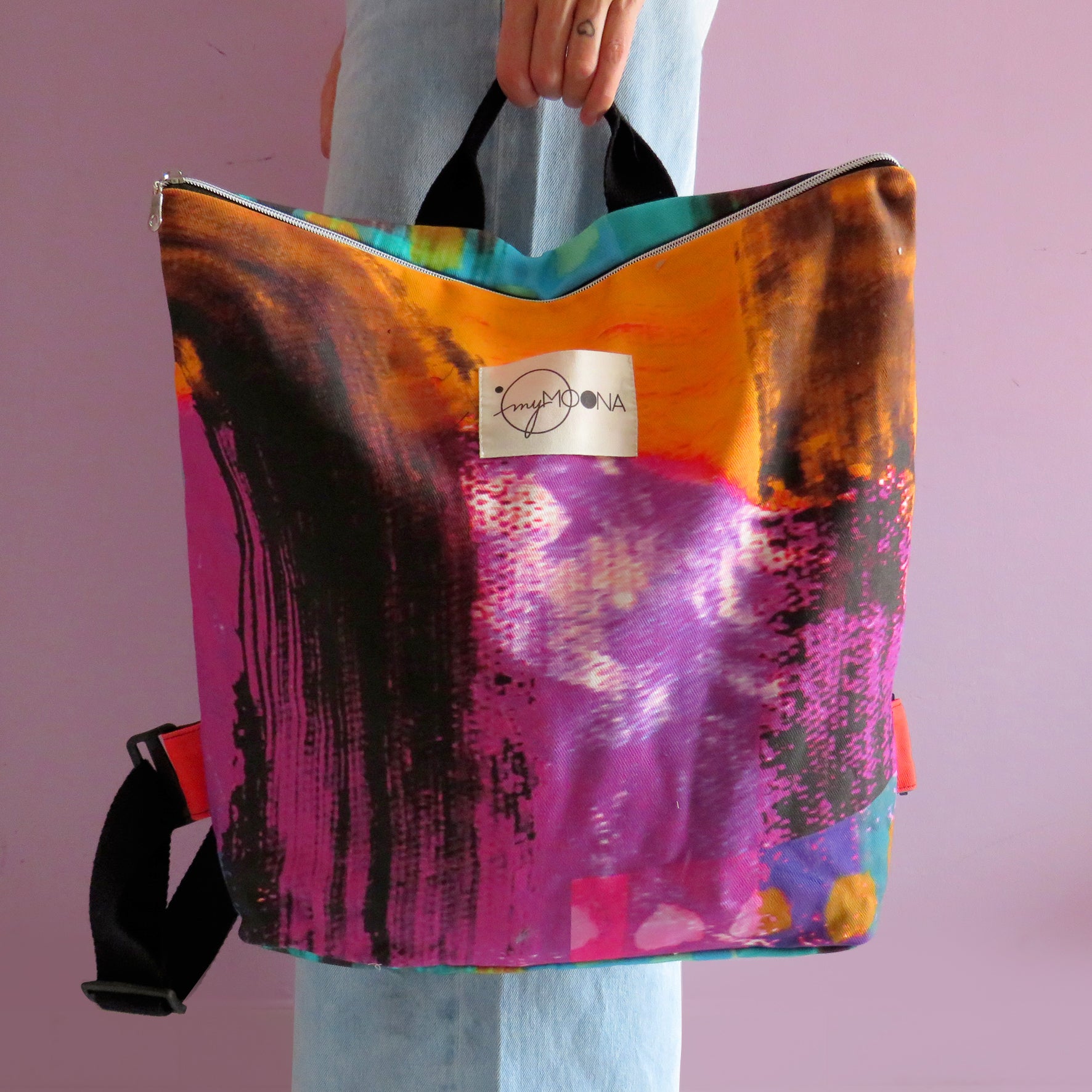 Zaino in cotone 380 gr, bretelle regolabili, chiusura superiore con cerniera, fodera interna, 45cm x 45cm circa.