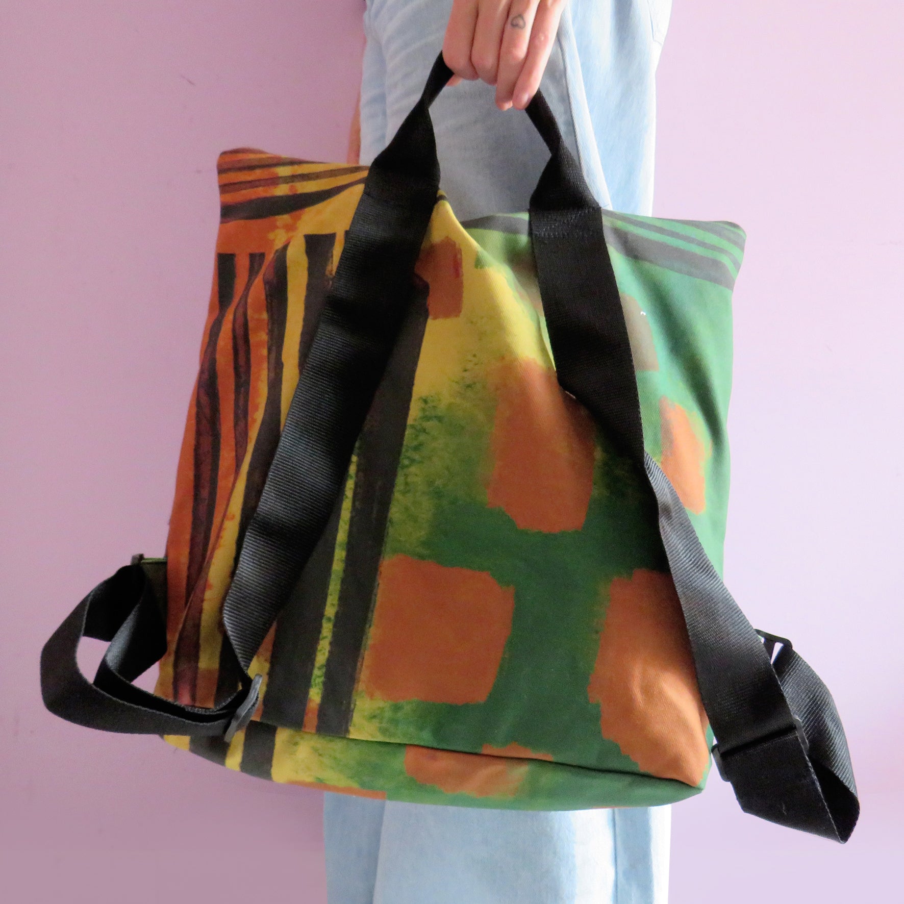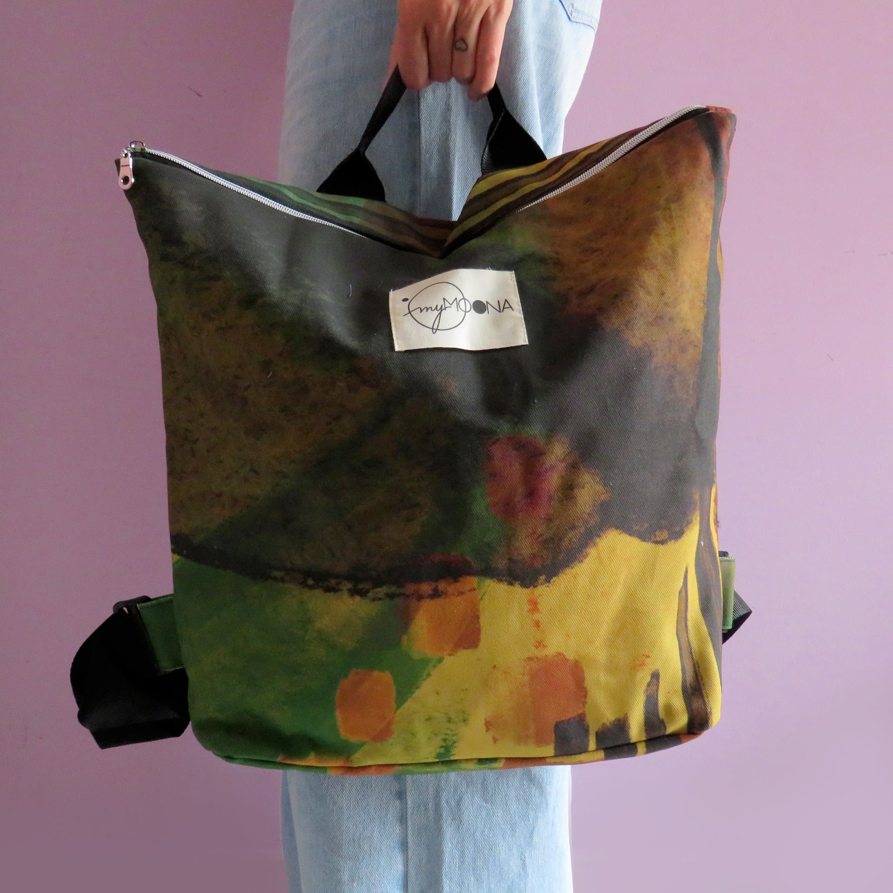 Zaino in cotone 380 gr, bretelle regolabili, chiusura superiore con cerniera, fodera interna, 45cm x 45cm circa.