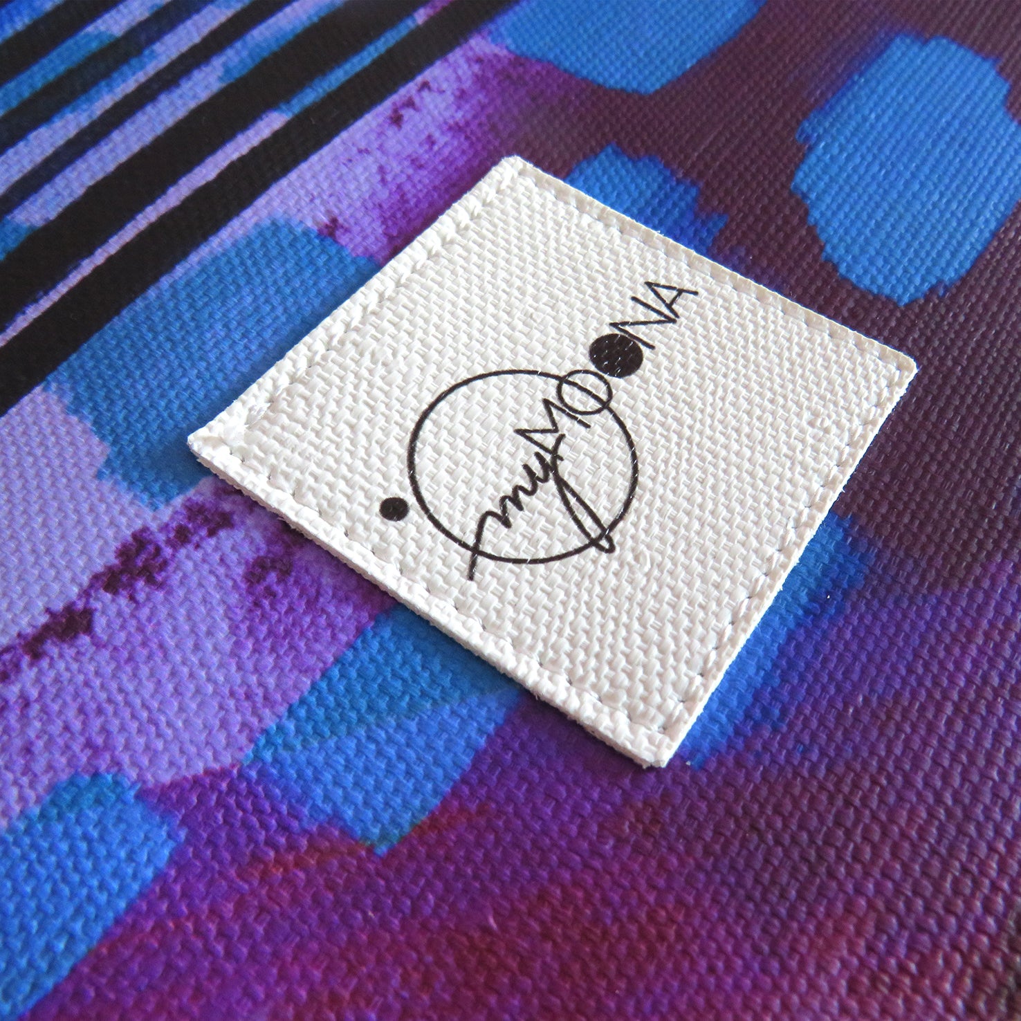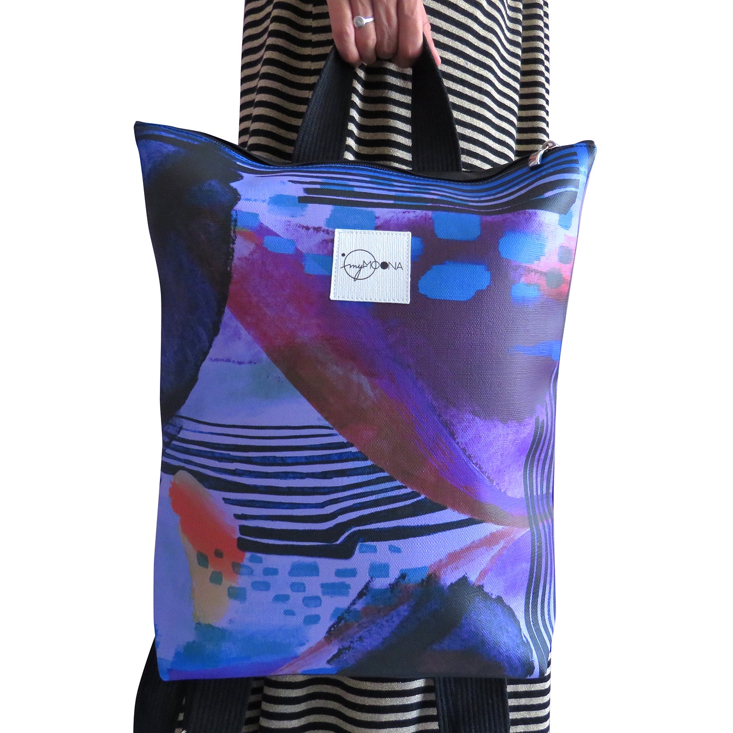 Zaino in synthetic canvas e ecopelle, tracolle in cotone. Fodera interna nera, chiusura con zip, 39 cm x 31 cm x 8 cm.