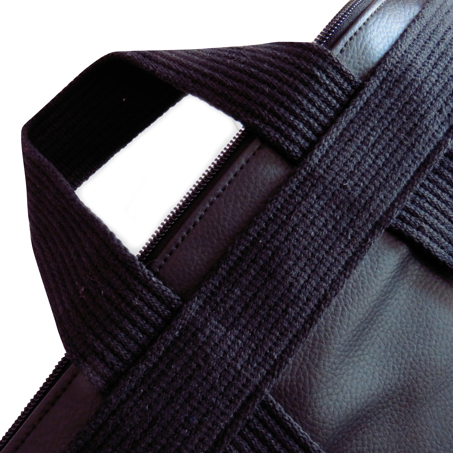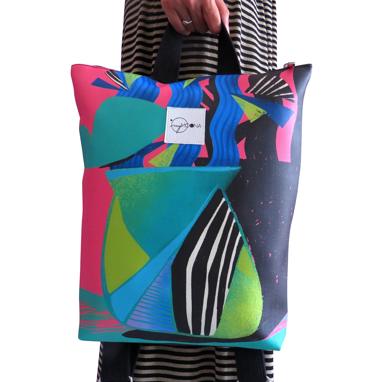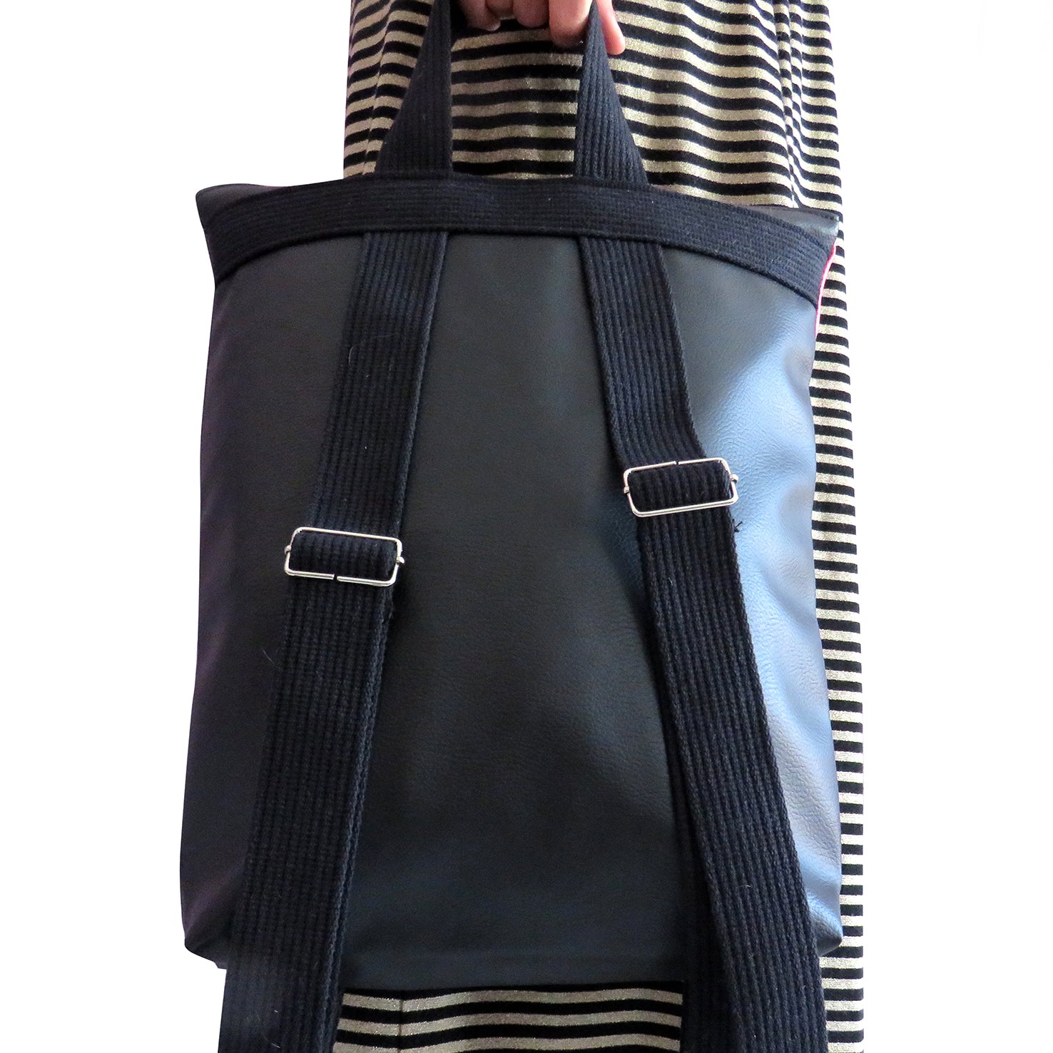 Zaino in ecopelle, tracolle in cotone. Fodera interna nera, tasca interna, chiusura con zip, 39 cm x 31 cm x 8 cm.