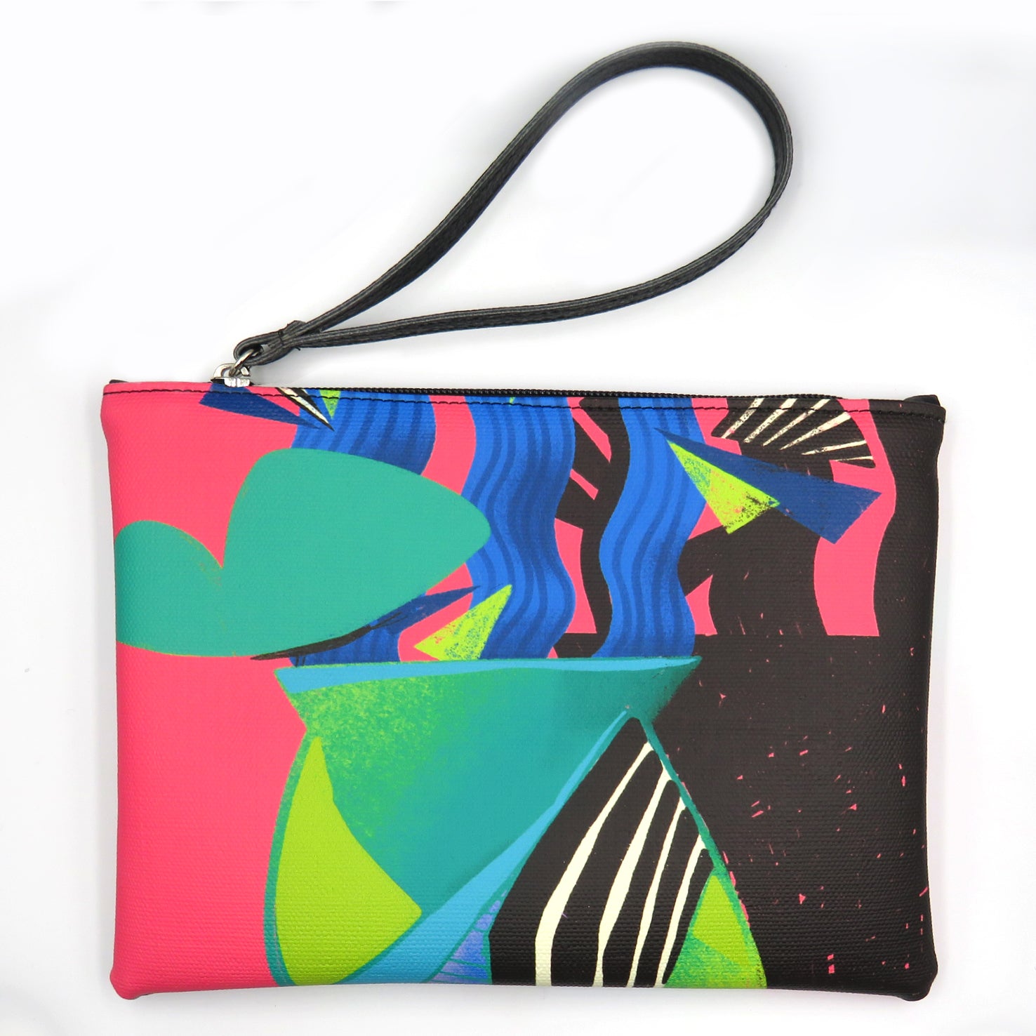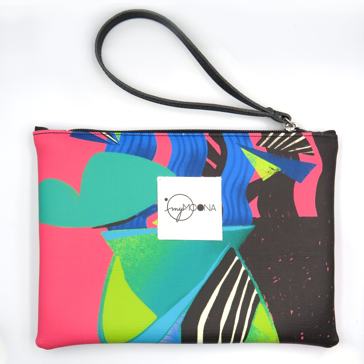Pochette in synthetic canvas, 24cm x 18cm, chiusura con zip e laccio da polso.