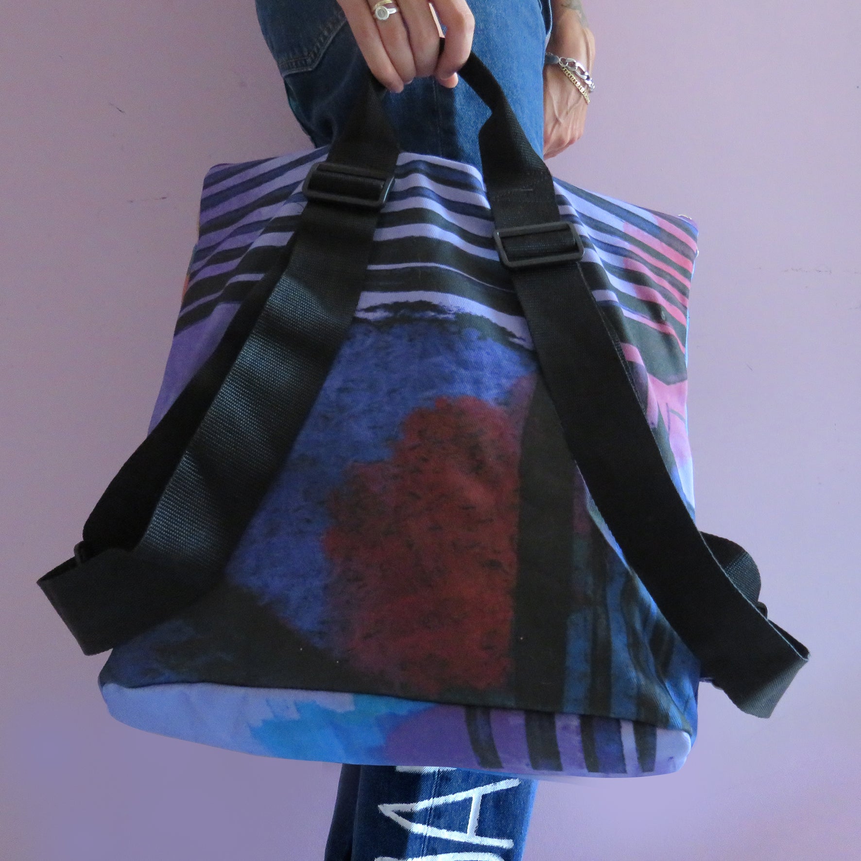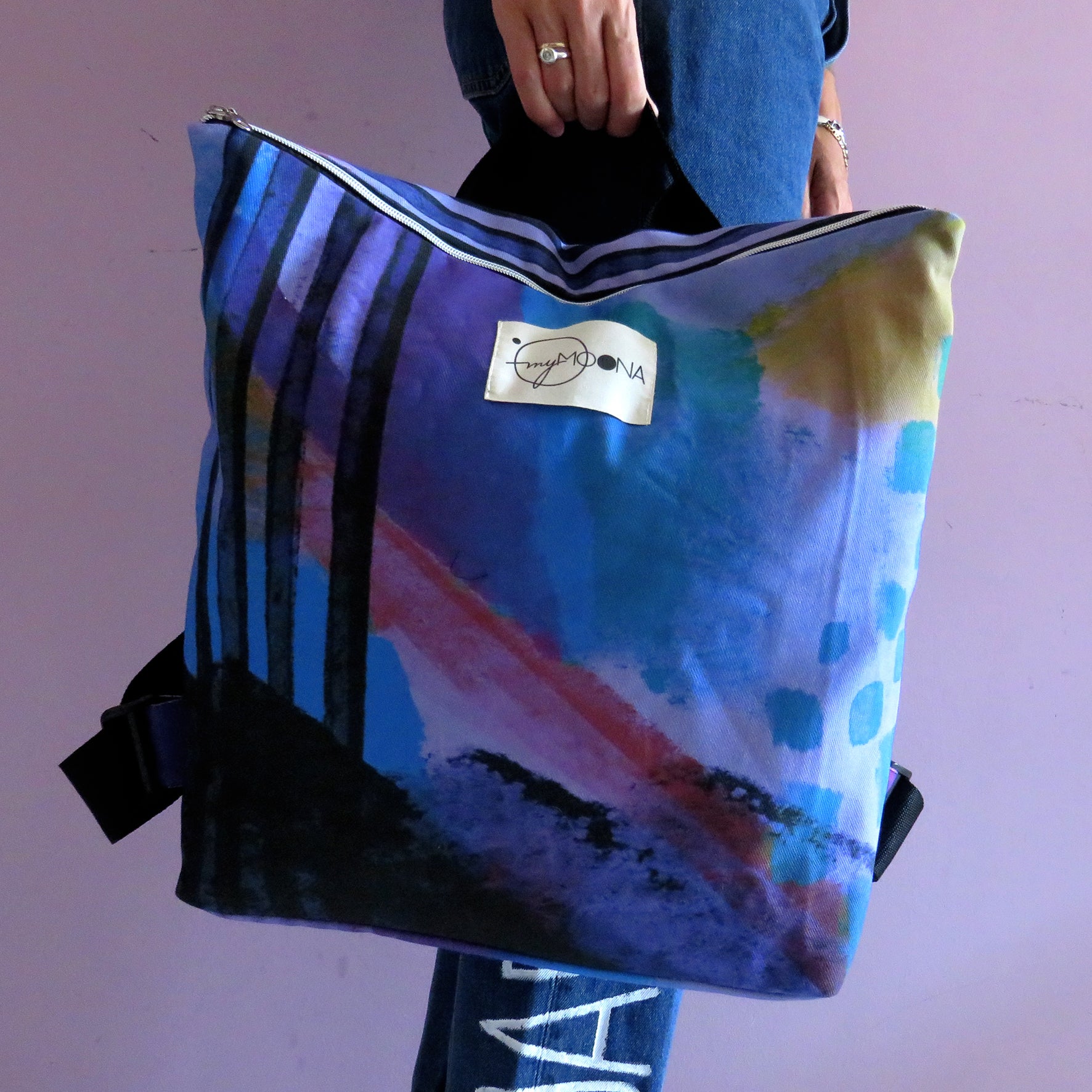 Zaino in cotone 380 gr, bretelle regolabili, chiusura superiore con cerniera, fodera interna, 45cm x 45cm circa.