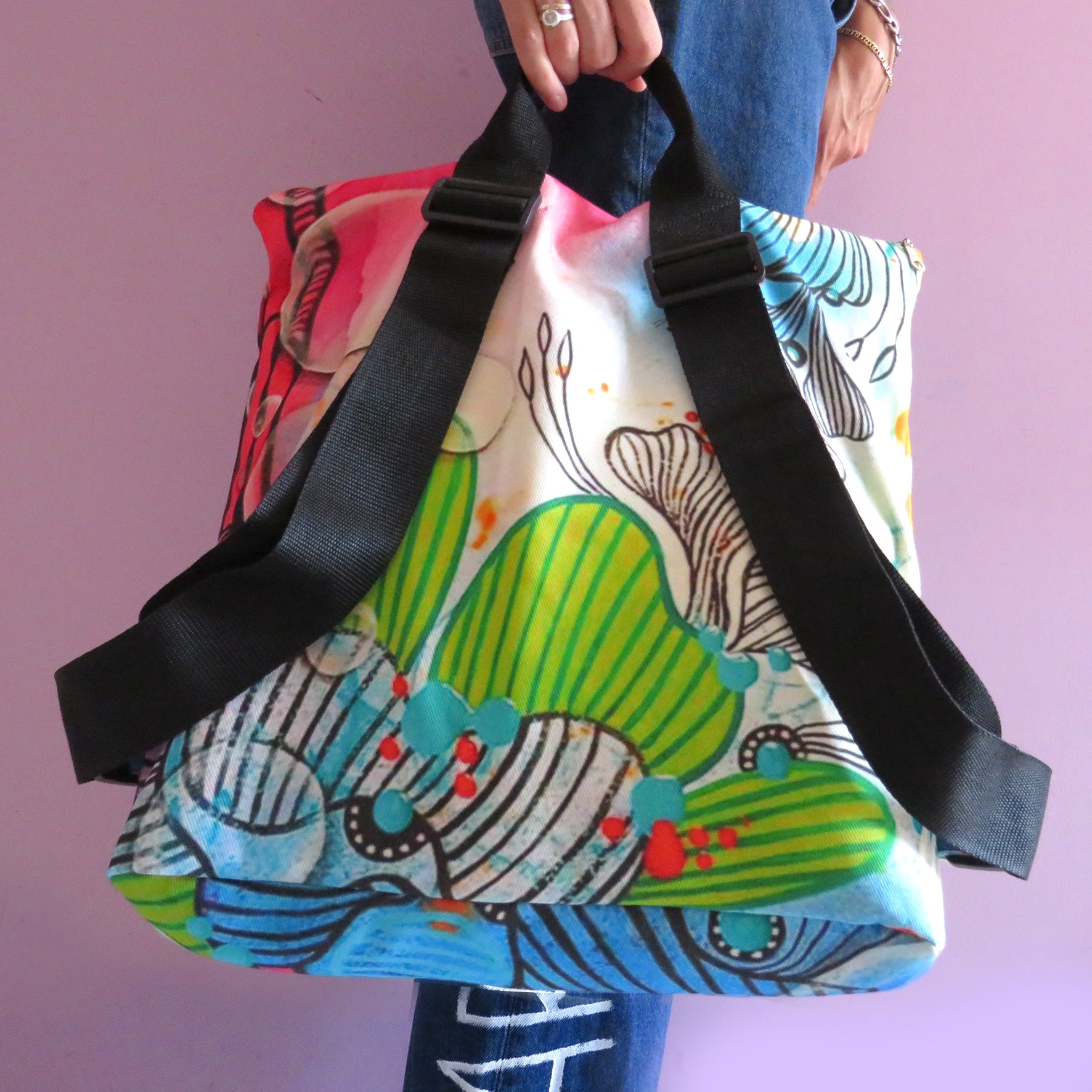 Zaino in cotone 380 gr, bretelle regolabili, chiusura superiore con cerniera, fodera interna, 45cm x 45cm circa.