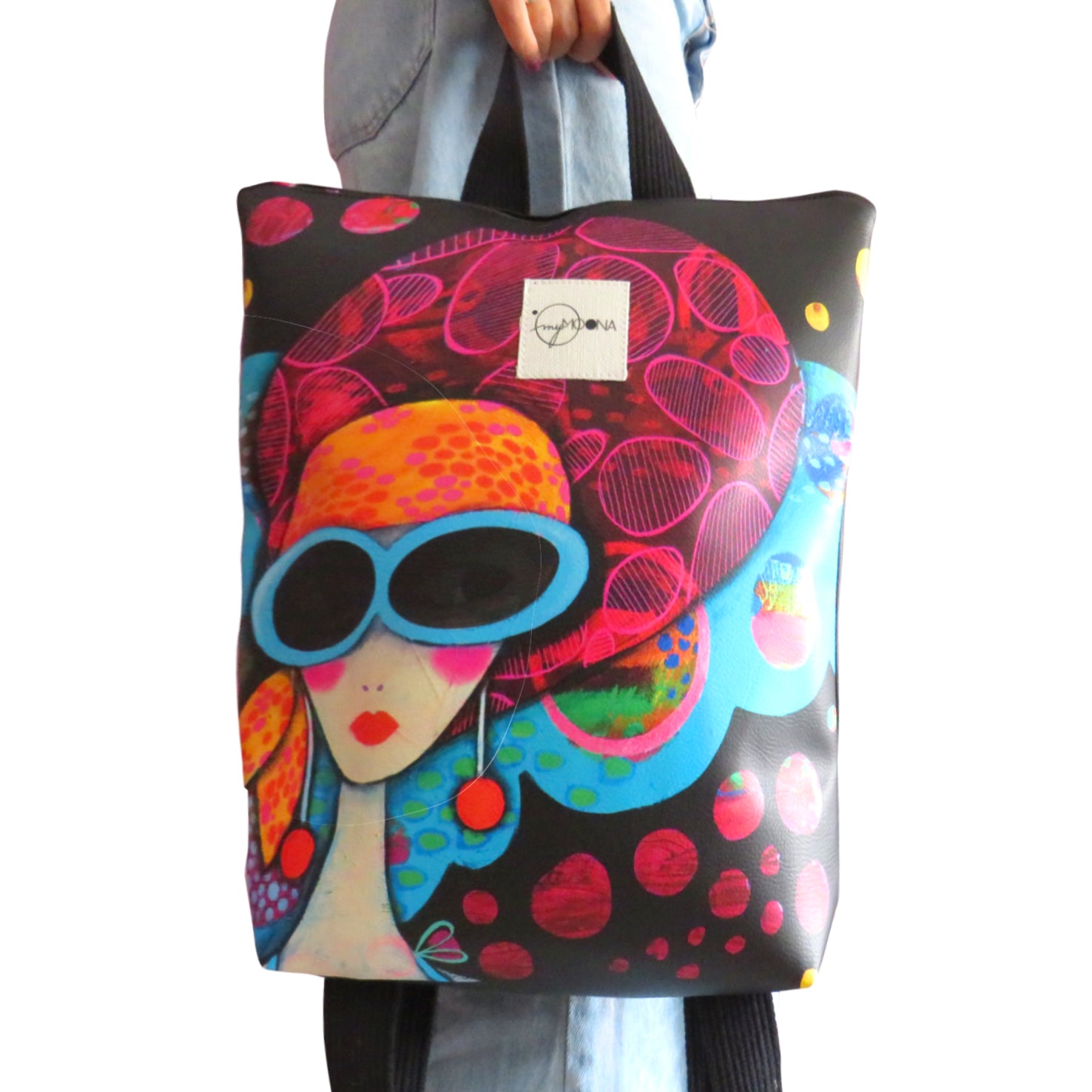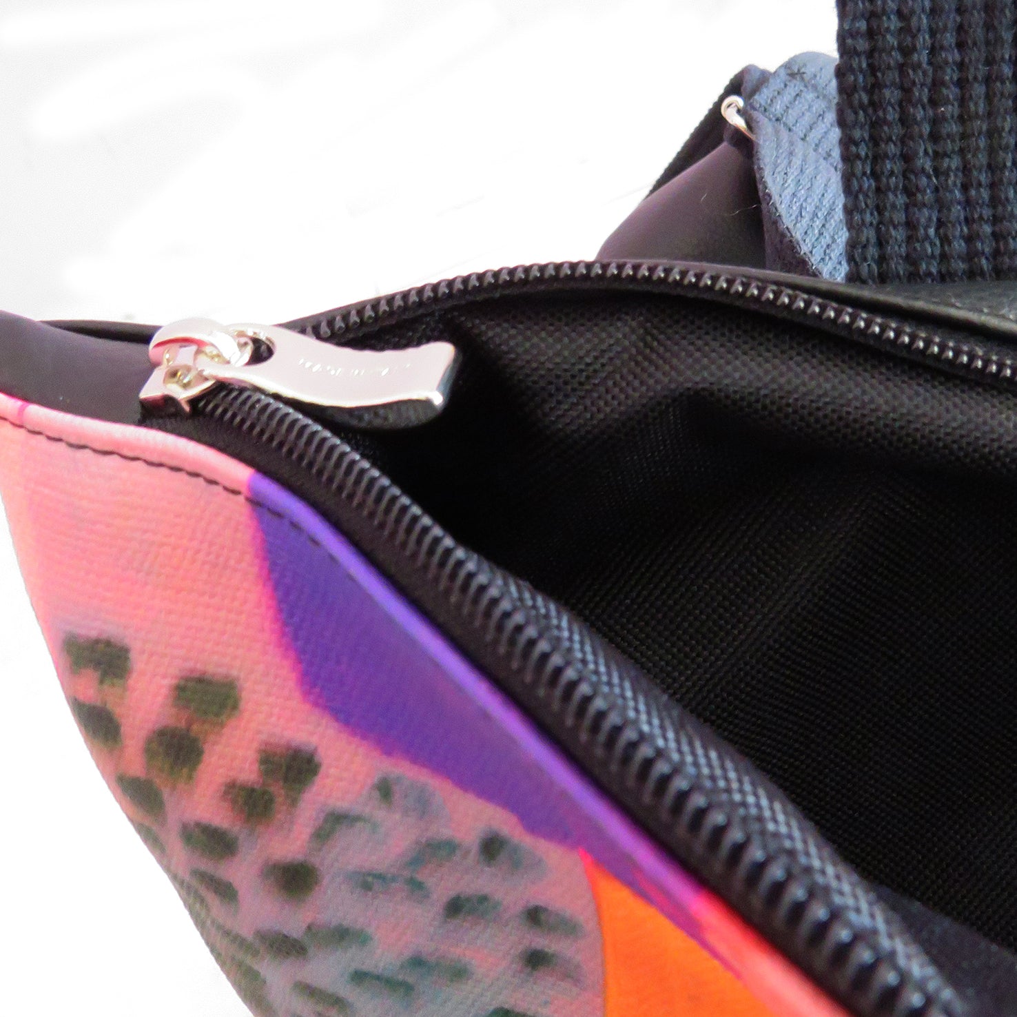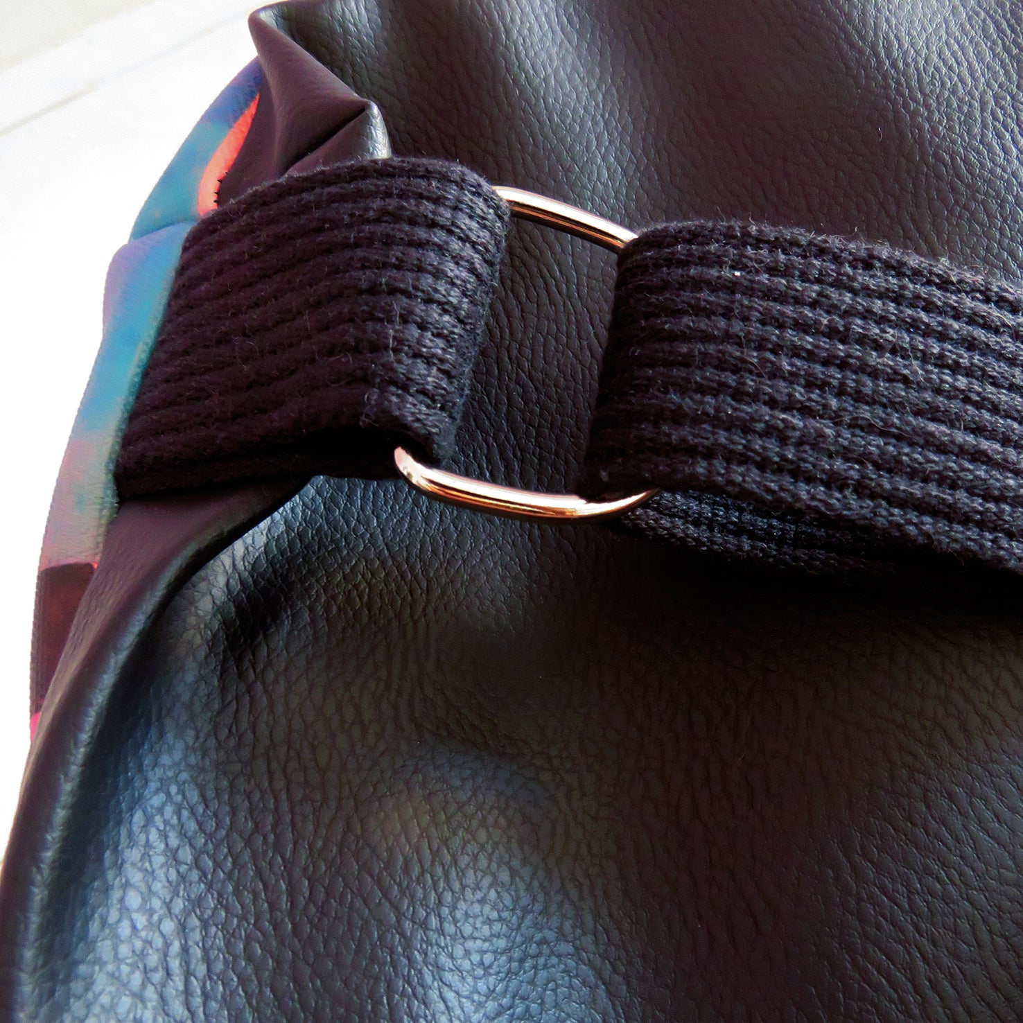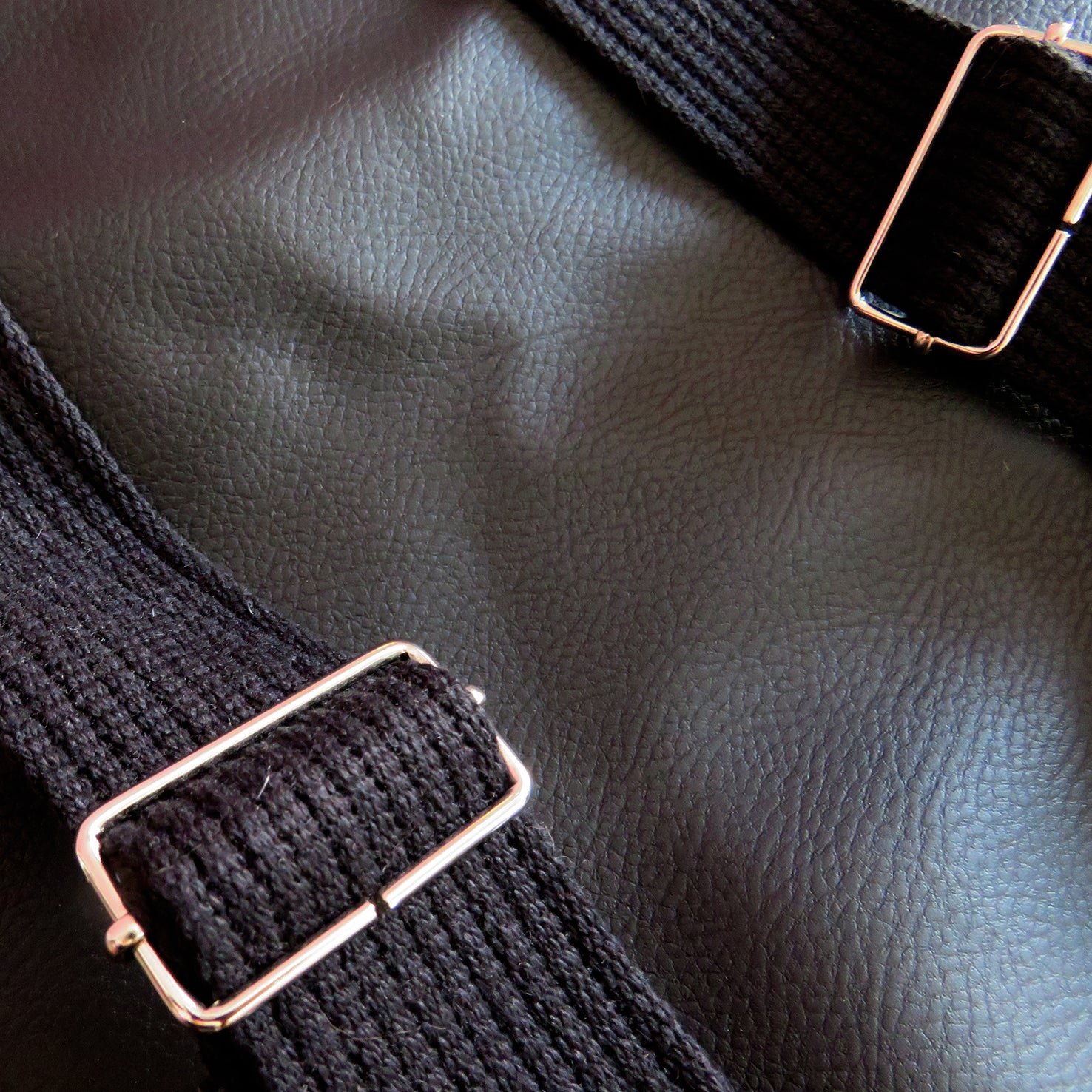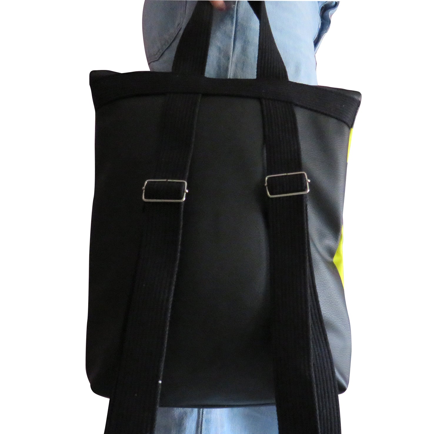 Zaino in ecopelle, tracolle in cotone. Fodera interna nera, tasca interna, chiusura con zip, 39 cm x 31 cm x 8 cm.