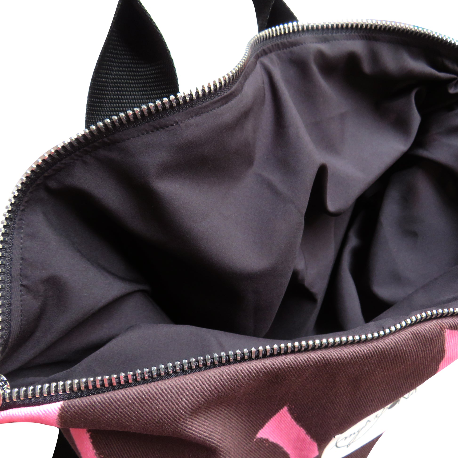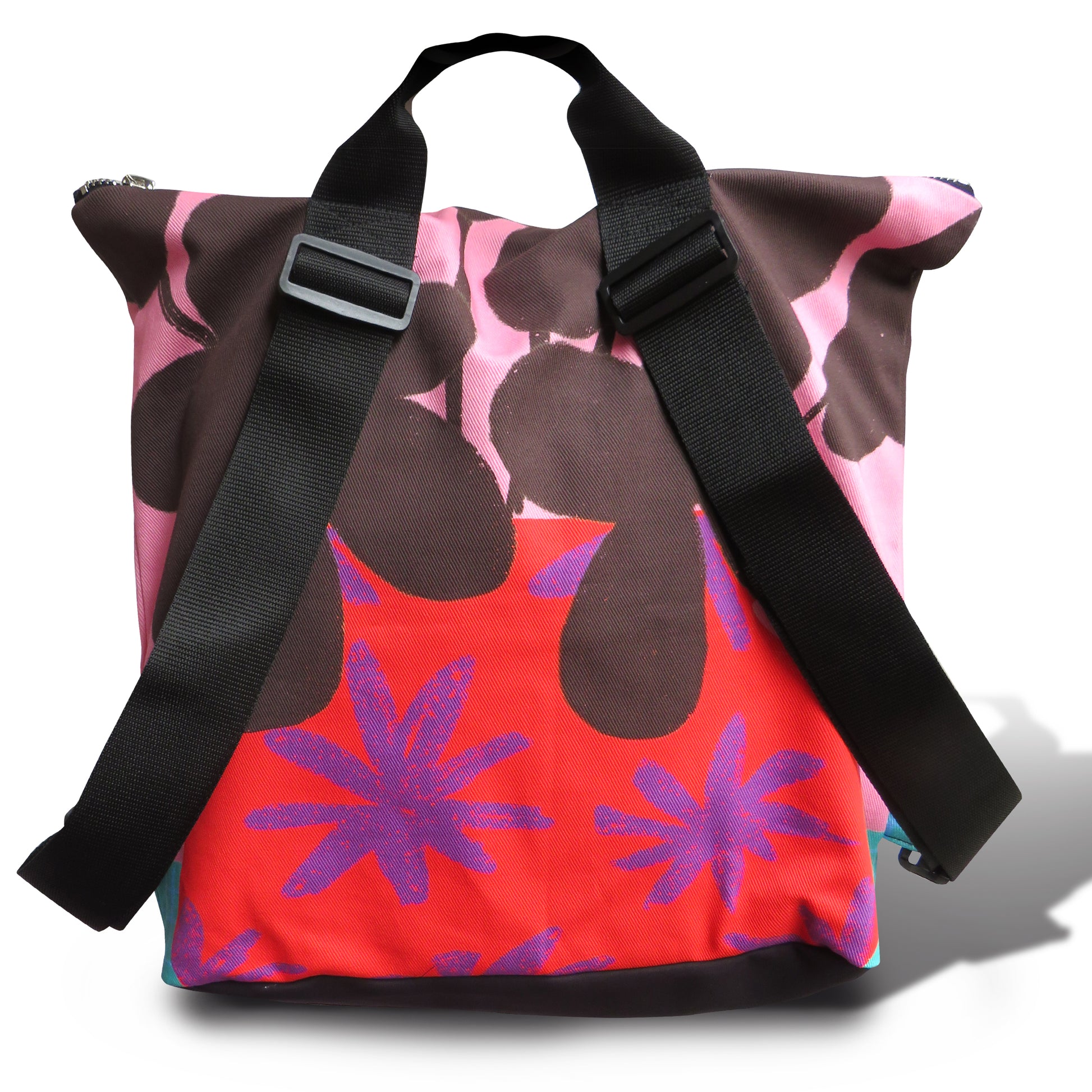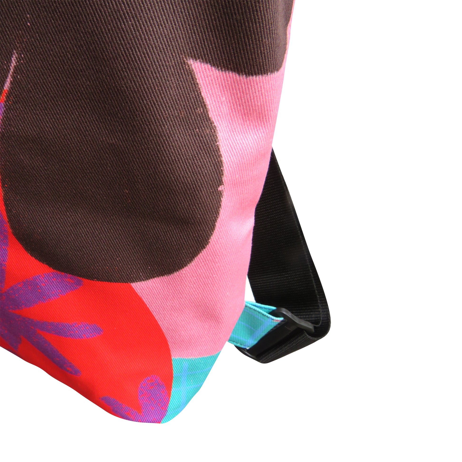 Zaino in cotone 380 gr, bretelle regolabili, chiusura superiore con cerniera, fodera interna, 45cm x 45cm circa.